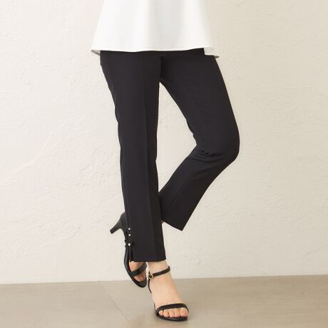 [型番:W5R10568__]デュアルストレッチ スリムパンツ【素材】減量加工により、タテヨコ両方向にストレッチ性を持たせた、程よいフィット感と動きやすさを兼ね備えた素材です。【デザイン・コーディネートポイント】定番の細身シルエットに、裾口を飾るブラックリボンモチーフとパールパーツ、さらにビジューをあしらい、上品な華やかさを添えたパンツです。※この商品はサンプルでの撮影を行っています。実際の商品とイメージ、仕様が異なる場合がございます。