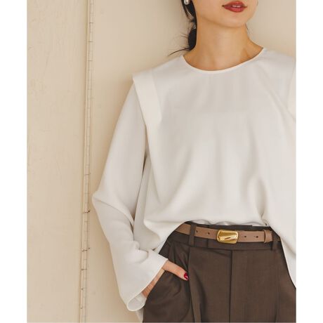 デザインはクルーネックで肌見せは控えめなシンプルデザインの中に、パワーショルダーの要素が入りトレンド要素も+。