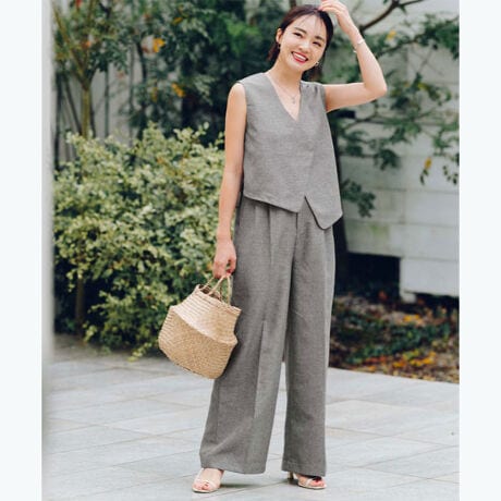 ◆DETAIL涼し気な素材のジレ&ワイドパンツのセットアップ。上下セットで着用はもちろん、別々で着用もおすすめです。ジレはデザインにこだわりアシンメトリーデザインに仕上げました。ボトムはベーシックなハイウエストワイドパンツで様々なコーディネートをお楽しみ頂けます。[型番:BFXN2064]