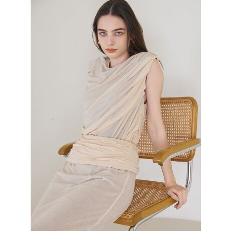 表と裏で全表情の違うリバーシブルトップス。表は変形タックでドレープをたっぷり効かせドレッシーな印象。