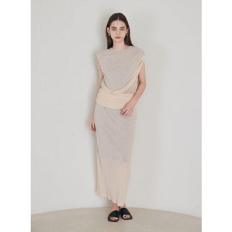 一見シンプルなタイトスカートですがリバーシブルでも着用でき、さりげない足元の透け感で夏らしさを演出してます。