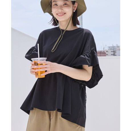ギャザーを効かせた袖フリルが女性らしさを出しつつ、さりげなく二の腕をカバーしてくれる1枚。