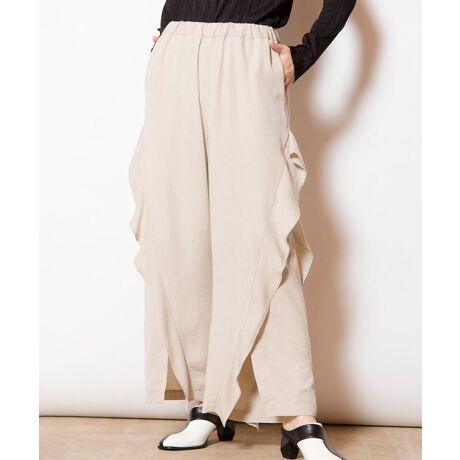 [型番:700006-270P]ベーシックなストレートパンツに、流れるようにフリルをデコレート。フロントにスリットを入れスッキリとした印象に。===========================透け感: ほぼなし(L.BEIGE)伸縮性: なし光沢感: なし裏地: あり(膝上)素材について: 表面にナチュラルなシワ感のある、麻ライクな風合い===========================