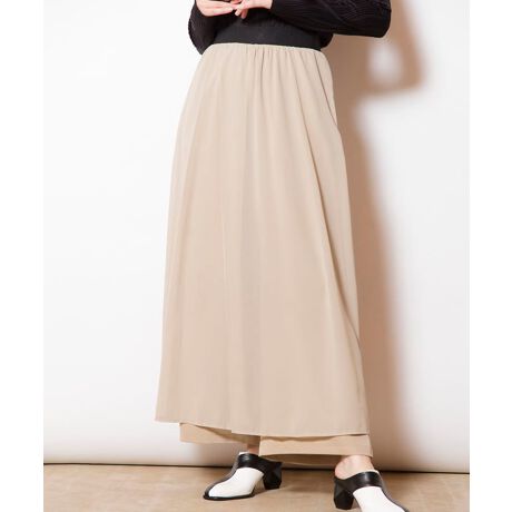スカートをレイヤードした様なデザインボトムは、シアーの軽快さをシックな色味で落ち着かせたマニッシュな仕上がり。