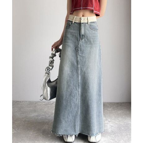 ウエスト部分の異素材切り替えが目を惹くロング丈デニムスカート♪