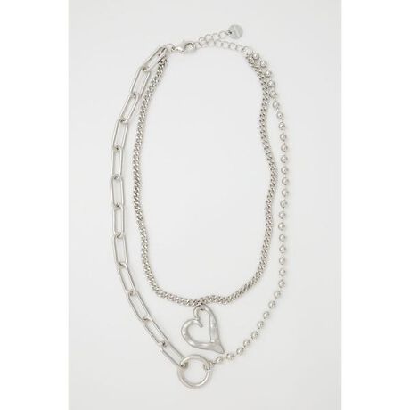 【ASYMMETRY CHAIN NECKLACE / アシンメトリーチェーンネックレス】■ポイントハートモチーフとアシンメトリーなチェーンがポイントの二連ネックレスです。■ディテールオリジナルのハート型とシンプルな丸のディテールを組み合わせたデザインで1つで重ね付けを叶えます。■スタイリングTシャツやタンクなどのシンプルカットソー、シャツなどこれからの季節のファッションにアクセントを加えてくれるアイテムです。ATT K-800お取り扱い上のご注意本品はデザイン性を重視した繊細なアクセサリーです・非常に引っ掛かりやすく、取れやすいのでご注意下さい。極度な力が加わると破損する事があります。・装飾部分は形や色に個体差があります。・皮膚に痒みや刺激を感じた際は使用をお止め下さい。・摩擦(特に汗や雨等で濡れた状態)により色落ちする可能性がありますのでご注意下さい。・金属アクセサリーの場合、消毒液に触れたり、皮脂および汚れの蓄積により、変色や変質する場合がございます。定期的にふき取りのメンテナンスをお願いします。消毒液が製品に直接かかる事が無いようご注意下さい。■商品のお気に入り登録お気に入りアイテムの再入荷・在庫1点などの通知を受け取ることができます。■ブランドのお気に入り登録新作アイテムの入荷や人気アイテムの再入荷、おすすめトピックスなど、いち早くブランドの情報を受け取ることができます。[注意事項]※画像の商品はサンプルです。実際の商品と仕様、加工が若干異なる場合があります。※画像の商品は光の照射や角度、お使いのモニター環境により、実物と色味が異なる場合がございます。※着用、お取り扱いの際は、アテンションタグをご確認ください。