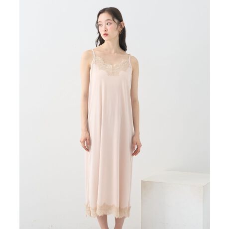 レイヤードスタイルに重宝するインナーキャミソールワンピース。光沢のあるとろみテクスチャーにレースデザインがより女性らしさをプラスします。肌に触れるとひんやり感じる接触冷感素材で夏シーズンにも最適。シャツや羽織りのインナーワンピースや、ペチコートとしても活躍する汎用性の高いアイテムです。透け感[ややあり]