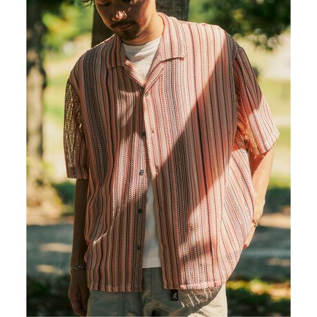 多色使いのラッセルレースストライプのオープンカラーシャツです。