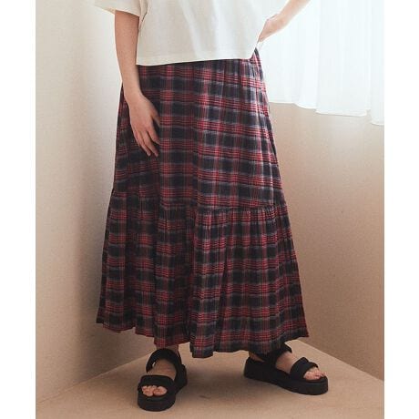 ふんわりと広がるシングルティアードが魅力的なイージースカート。やさしいコットン生地にクリンクルワッシャー加工を施したナチュラルな素材感も魅力です。ウエストのフリルで甘さを加え、トップスをインしたスタイリングにも最適なデザイン。総ゴムタイプでストレスフリーにご着用いただけます。シンプルなワントーンカラーにチェック柄を加えた4色展開。