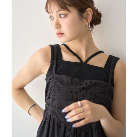 タンクトップとキャミソールのレイヤード風デザインが今年らしい1枚。伸縮性の良いリブ生地で程よいフィット感のある着心地です。暑い季節にも嬉しい、さらりとしたコットン混素材を使用。メインではもちろんワンピースやシャツのインナーとしてデイリーに活躍するおすすめのアイテムです。透け感[ややあり]