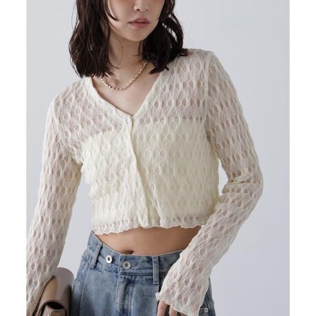 幾何柄のシアーチュール素材を使用した軽やかな雰囲気のカーディガンです。身頃と袖にギャザーを施した立体感のある仕上がりがポイントで、コーディネートに旬な表情をプラス。襟ぐりと前立ては見返しをつけてすっきりとした印象に。袖口はスリット入りで着用すると自然なフレアスリーブシルエットになります。コンパクトなサイジングなのでカーゴパンツやワイドパンツ合わせがオススメ。前を閉じてはもちろん、ボタンを開けてさらっと羽織るコーデも楽しめます。※モデルの着用画像の場合、光の当たり具合により、実際の色味と異なって見えることがございます。色味は、商品単体の画像をご参照ください。
