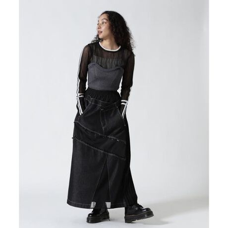 ライトオンスデニムをメインに、斜めに切ってリメイクしたかのような、異素材切り替えが目を惹くスカート。
