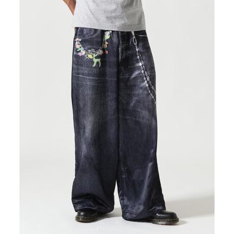 ROYAL FLASH 別注商品転写プリントのパイオニアでもあるTATAよりROYAL FLASH別注アイテムをリリース。デザイナーが1990年代に着用していた60年代から70年代のVINATGE DENIMを精巧にPRINT。本来WORK WEARとしてのアイテムをWIDEシルエットにする事で当時ではない違和感を演出していると同時に、光沢やドレープを付け加えることで、ジャンルレスかつ幅広い着こなしを楽しめる一本。細部のアクセサリーなどをグラフィックWORKでプラスしスタイリングのアクセントに。経年変化や当時の空気感はそのままに。軽量で光沢のあるサテン生地を用いる事で、既製品にはない表情とストレスフリーで着用出来る抜群の着心地は、これからの暑い季節に重宝出来るアイテムとなっております。※商品の色味につきまして、お客様のお使いのPCのモニター環境により実際のカラーと画像の色味が違って見える場合が御座います。予めご了承の上、ご注文下さい。※着用の撮影画像は光の加減で、実際の商品より明るく見える場合が御座います。商品の物撮り画像で色味はご確認お願い致します。TALKING ABOUT THE ABSTRACTION/トーキングアバウトジアブストラクションブランドコンセプトは「作品製作に携わる全てのヒトとの共存デザイン」。コンセプトに対するイメージを服のディティールに入れ、ヒトが見る・着るをする上で、それを探り、想像。「TALKING ABOUT THE ABSTRACTION」は“ 古い物や文化 近代の物や技術 ”すべてに同等の価値があると想定して、その配分を調整配合し創る、新しい価値観を持つ、性別を問わない、少数派の為の普段着。