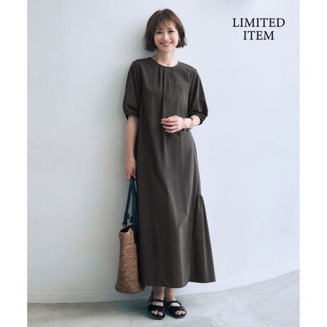 裾の切り替えデザインが1枚でもサマになるワンピース■デザイン1枚でさらりと着用できるナローシルエットのワンピースです。裾は後ろからやや前にかけて切り替えを入れることで、裾にかけてボリューム感を持たせ、大人っぽく華やかなシルエットを演出ています。二の腕が隠れる袖丈なのも嬉しいポイントです。前後の襟ぐりにはギャザーディテールを効かせています。肌離れの良いデザインで機能素材を使用しているので、雨の日も重宝するアイテムです。■素材コットンライクな特殊ナイロン糸をタテとヨコに使用した高機能素材です。ヨコ糸に太番手を使用することで、ミニグログランのような表情と程よい張り感を表現しました。リサイクル原料を使用し、環境にも配慮した素材です。UVカット、接触冷感、撥水の3つの機能もあります。