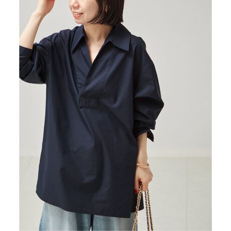程良い開きがデコルテラインをきれいに見せてくれるスキッパーシャツ。