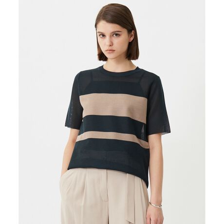 ■デザイン大胆なピッチがICBらしい、エッジの効いたラインボーダーニットTEE。程よいシアー感と爽やかな配色感が大人上品な印象で、カジュアルになりすぎず夏のスタイリングを涼しく軽やかに見せてくれます。どんなボトムとも合わせやすいサイズ感とストレートシルエットで、幅広いシーンで活躍してくれること間違いなしです。そのまま一枚でももちろん、ジャケットに合わせると程よくカジュアルダウンした抜け感のあるスタイルに仕上がります。