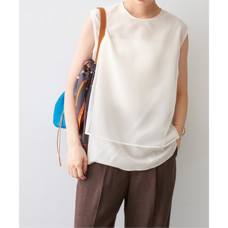 とろみのある素材にオーガンジーを重ねた、ニュアンス感あふれるレイヤードデザインが魅力のスリーブレスプルオーバー。