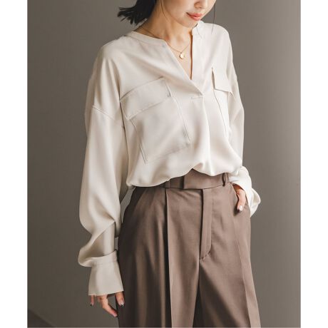 光沢のある素材や潔く開いたVネックなどの女性らしいデザインの中に、胸元には大きめのポケットを取り入れたりと、程よく大人っぽさを加えスパイスをプラス。