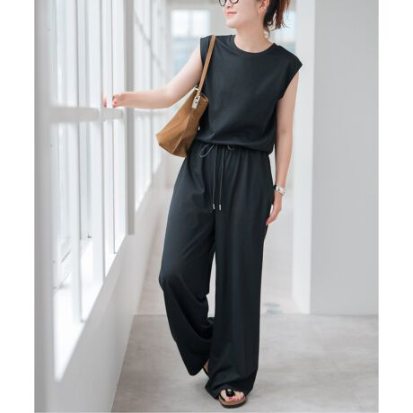 ポリエステルを裏面にプレーティングした上品な天竺素材を使用した、カットソーオールインワン。