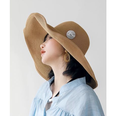 緩やかな曲線を描く広めのブリムが顔まわりをしっかりカバーしてくれる、エレガントなムード漂うサマーハット。帽子サイドにはメタルボタンをあしらい、クールなアクセントをプラス。