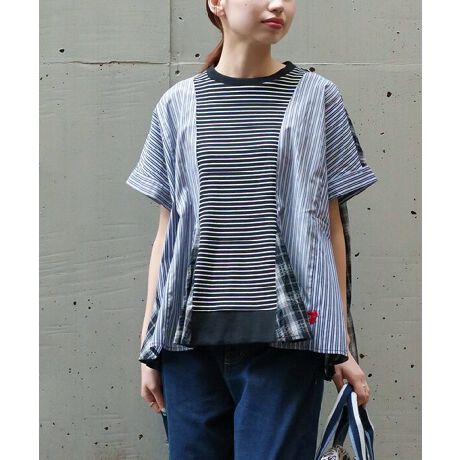同じ表情のみじんこボーダーをカットソーと布帛で表現し、一つのプルオーバーにまぜ込みました。