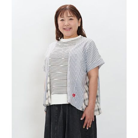 同じ表情のみじんこボーダーをカットソーと布帛で表現し、一つのプルオーバーにまぜ込みました。