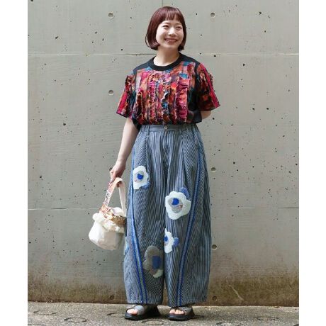 サガラ刺繍で埋め尽くした花のようなモチーフが大胆に施されたデニムパンツです。