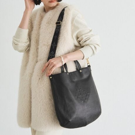 ・シンプルながらもモチーフのエンボスやショルダーストラップで上品な華やかさをプラス。