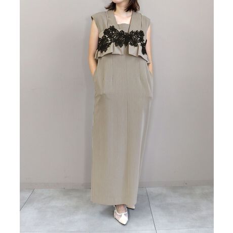 マニッシュなピンストライプに繊細な刺繍レースのビスチェを重ねた、ANDRESDらしいミックススタイルを、より軽やかに楽しめるスリーブレス仕様で再構築しました。