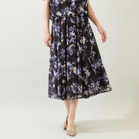 ローズティアラオリジナルのフラワープリントが上品な印象のフレアスカート。