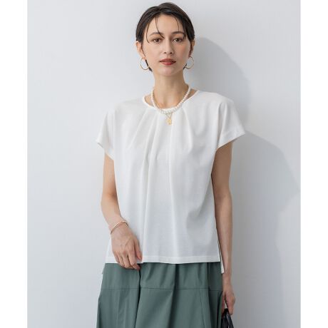シンプルなクルーネックに、イレギュラーなタックディテールを効かせたフレンチスリーブトップス。シャープなタックラインとややゆったりとしたサイズ感が、身体のラインを拾いすぎず、すっきりとした印象を演出します。同素材のガウチョパンツやロングスカートと合わせて、洗練されたセットアップスタイルを楽しむのがおすすめです。シンプルながら一枚で着映えし、夏のオフィススタイルから休日のお出かけまで、様々なシーンで活躍します。接触冷感素材で、暑い日にも快適に着られるのもうれしいポイント。カラーは、清潔感のあるホワイト(#001)、落ち着いた印象のグレー(#004)、シックなブラック(#005)、明るい印象のアプリコット(#022)、ニュアンス感のあるブラウン(#030)、洒落感のあるモスグリーン(#053)の6色展開です。