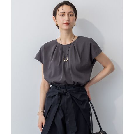 シンプルなクルーネックに、イレギュラーなタックディテールを効かせたフレンチスリーブトップス。シャープなタックラインとややゆったりとしたサイズ感が、身体のラインを拾いすぎず、すっきりとした印象を演出します。同素材のガウチョパンツやロングスカートと合わせて、洗練されたセットアップスタイルを楽しむのがおすすめです。シンプルながら一枚で着映えし、夏のオフィススタイルから休日のお出かけまで、様々なシーンで活躍します。接触冷感素材で、暑い日にも快適に着られるのもうれしいポイント。カラーは、清潔感のあるホワイト(#001)、落ち着いた印象のグレー(#004)、シックなブラック(#005)、明るい印象のアプリコット(#022)、ニュアンス感のあるブラウン(#030)、洒落感のあるモスグリーン(#053)の6色展開です。