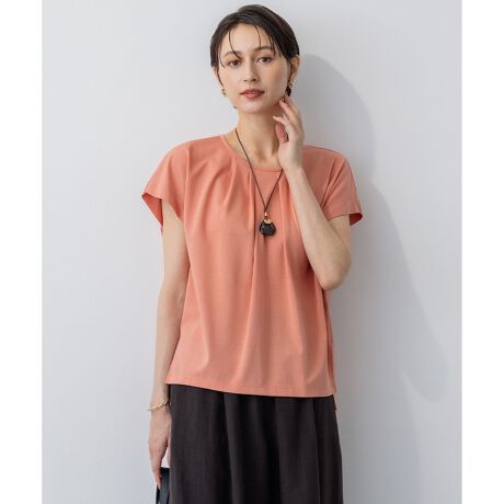シンプルなクルーネックに、イレギュラーなタックディテールを効かせたフレンチスリーブトップス。シャープなタックラインとややゆったりとしたサイズ感が、身体のラインを拾いすぎず、すっきりとした印象を演出します。同素材のガウチョパンツやロングスカートと合わせて、洗練されたセットアップスタイルを楽しむのがおすすめです。シンプルながら一枚で着映えし、夏のオフィススタイルから休日のお出かけまで、様々なシーンで活躍します。接触冷感素材で、暑い日にも快適に着られるのもうれしいポイント。カラーは、清潔感のあるホワイト(#001)、落ち着いた印象のグレー(#004)、シックなブラック(#005)、明るい印象のアプリコット(#022)、ニュアンス感のあるブラウン(#030)、洒落感のあるモスグリーン(#053)の6色展開です。