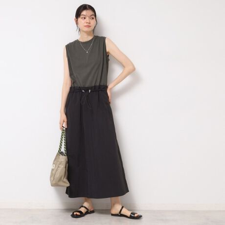 きれいめなバインダー襟のノースリーブに、ポリエステル素材のスカートがドッキングしたワンピース。