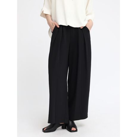 フロントに施されたインタックが余白を埋めスタイルを良く魅せてくれるワイドパンツ。トップスを選ばず幅広いスタイルに合わせやすい間違いなしな逸品。ウエスト部分はゴム仕様に紐で調節可能なところが嬉しいポイント。ノンストレスを追求しながらも大人スタイルに決めてくれる今季活躍する一品です。