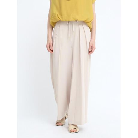 リラクシーな着心地かつシンプルなノーマルデザインでどんなコーデにも合わせやすいワイドパンツ。センターに入るインタックに、揺れるドレープ性が余白を埋め下半身を綺麗に魅せてくれる逸品。細かな金具はゴールドに仕上げ、上品さや大人っぽさを醸し出します。トップスを選ばず雰囲気に寄り添うナチュラルさや総ゴムタイプが嬉しいポイントです。