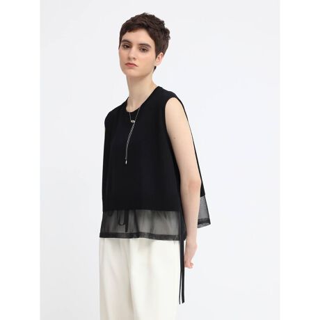 シンプルなデザインでありながら、どこかフェミニンで特別感のあるニットベスト。シンプルな佇まいのなかに、裾部分のシースルー素材が上品な抜け感を演出してくれます。サイドのリボンはフェミニンなアクセントに。一枚での着用も、カットソーやシャツとのレイヤードスタイルもおすすめなアイテムです。