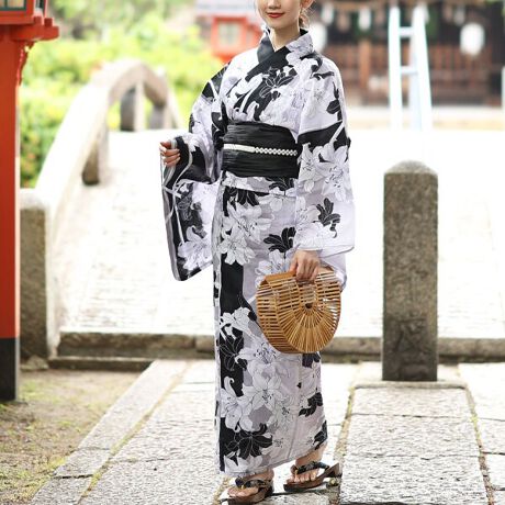 上下セパレート浴衣、インナー、帯の4点セットです。セパレートなので簡単にひとりでも着付けができます。近年の酷暑でも快適に着られる、透け感のある涼しいシアー浴衣。熱気や湿気をすっと逃がして清涼感のある着心地が続きます。インナー肌着付きなので中に着る服に困ることなく、仕立て上がりですのでお届け後すぐにお召しいただけます。帯は、兵児帯です。他の帯と比べてとても軽く、体への締め付け感も少なめですので時間を過ごされる場合でも苦しくなりにくい帯です。大人の色っぽさ漂う百合柄です。足元をサンダルやスニーカーにして着用するのもオススメです。※こちらの商品は透け感があります為、セット肌着の着用をお勧めいたします。
