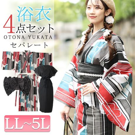 【大きいサイズ】 レトロ矢羽根柄上下セパレート浴衣&結び帯&インナー4点セット 大きいサイズ 浴衣