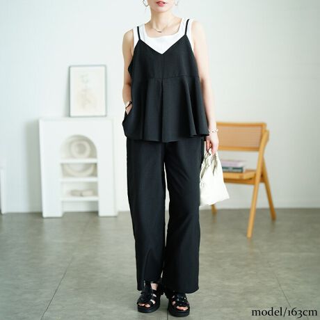 ペプラムフレアなデザインのキャミソールに、ワイド幅のストレートパンツのセットアップ。ふんわりとしたシルエットで愛らしい印象を放ちながら、ハンサムなワイドパンツとも相性抜群。セットアップアイテムだから、セットでも別々でも楽しめ、コーデの幅もグンと広がります。広めのアームホールでゆったりとしたキャミソールは、フレアシルエットでお腹周りをカバー。アジャスター付きの肩紐だからお好みの丈感に調節が可能です。ワイドパンツでゆったりと下半身をカバーしながら、ハンサムでスタイリッシュな印象に。