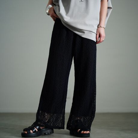 カットレースが重ねられた品の良さが漂う、リラクシーなパンツは穿くだけで高見えする一枚。足下のエアリーな透け感が軽やかな印象をプラスし、シックなブラックカラーデザインでも重たくなり過ぎず、ロングシーズン楽しめる大人見えコーデにマストなパンツです。トレンドに左右されない、すとんとしたストレートパンツだからすっきりと着用でき、ワイド幅デザインでゆったりとリラクシーに体型カバーしてくれる頼れるパンツ。ウエストゴム仕様だから体型を選ばず、オンにもオフにも馴染む着こなしやすいアイテム。