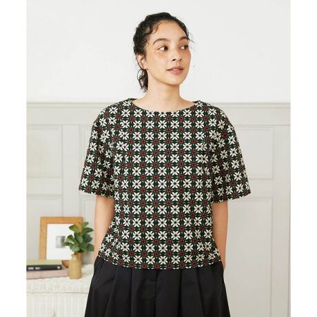 ホコモモラらしい総柄のブラウス。テーマの「BLACK AND WHITE」からインスピレーションを受けています。お花と幾何柄を組み合わせたカラフルな柄はレトロな印象に。裾にかけてフレアがかっているゆったりとしたシルエット。ドロップショルダーで柔らかい雰囲気に。首元のカットが深めのプルオーバーデザインで日常使いからお出かけまで幅広く着まわせる一枚です。目を惹く柄のブラウスは今季イチオシのアイテムです。