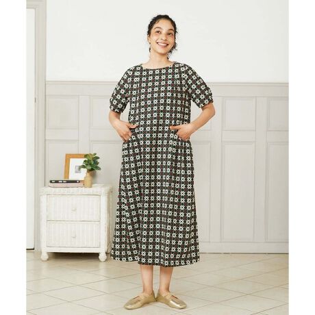 ホコモモラらしい総柄のワンピース。テーマの「BLACK AND WHITE」からインスピレーションを受けています。お花と幾何柄を組み合わせたカラフルな柄はレトロな印象に。長めの着丈で、体のラインを拾いにくいシルエット。縦からサイドかけて入った切り替えがウエスト周りのスッキリ見えも叶えます。袖口のタックの丸みや、切り替えを利用したサイドポケットに施されたギャザーが女性らしい優しい印象に。後ろの涙開きにも注目。目を惹く柄のワンピースは今季イチオシのアイテムです。