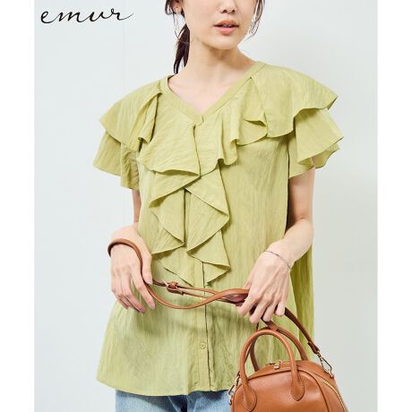 ・ラッフルカラーとフリルスリーブを重ねた前開きブラウス。