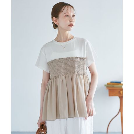 ・胸元のシャーリングデザインが大人可愛い布帛ドッキングトップス。