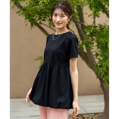 ・主役級の一枚、着映えするチュニック・肌触りの良いカットソーの身頃と表情感のある素材を切り替え・ジャージー部分は透けが気になりにくいポンチを使用し、綺麗めな見え感・トレンドのバルーンシルエットで大人可愛い印象・チュニック丈で気になる腰回りをしっかりカバー