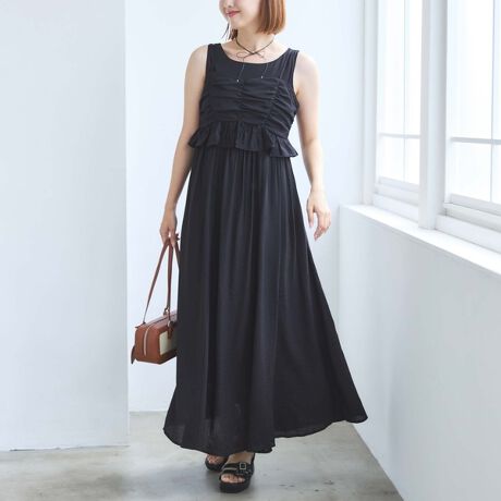 シンプルなノースリーブワンピースとギャザービスチェのセットアイテム。