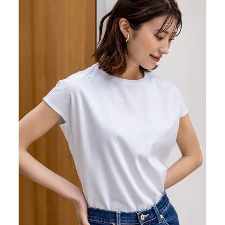・今シーズン注目のビジューを散りばめた着映えトップス・ボックスシルエットのシンプルな形ながら、コーディネートのポイントになる一枚・透けが気になりにくいポンチを使用しており、夏に着用しやすいアイテム・フレンチスリーブで二の腕をカバーし、袖下マチ付きで脇下もしっかりカバー・ボトムインしなくても様になる丈感