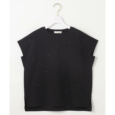 ・今シーズン注目のビジューを散りばめた着映えトップス・ボックスシルエットのシンプルな形ながら、コーディネートのポイントになる一枚・透けが気になりにくいポンチを使用しており、夏に着用しやすいアイテム・フレンチスリーブで二の腕をカバーし、袖下マチ付きで脇下もしっかりカバー・ボトムインしなくても様になる丈感