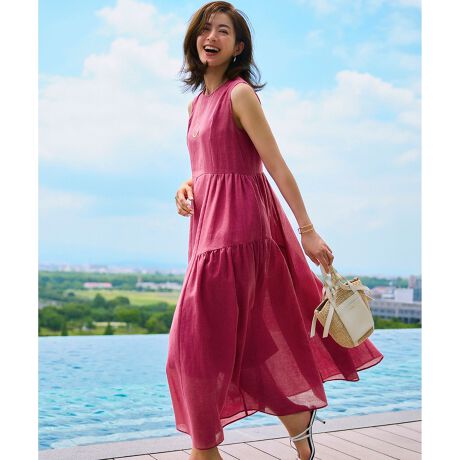 ラミー特有の素材感を活かした清涼感が魅力のノースリーブワンピース。ウエストマークしたフィット&フレアーシルエットで、ウエストと膝脇にティアード風のアクションギャザーをつけ、さりげなく甘さを効かせたデザインです。カラーは、1枚で華やかさのあるローズ(#011)、こなれた雰囲気を醸すブラウン(#035)、気品を感じさせるネイビー(#075)の3色展開です。